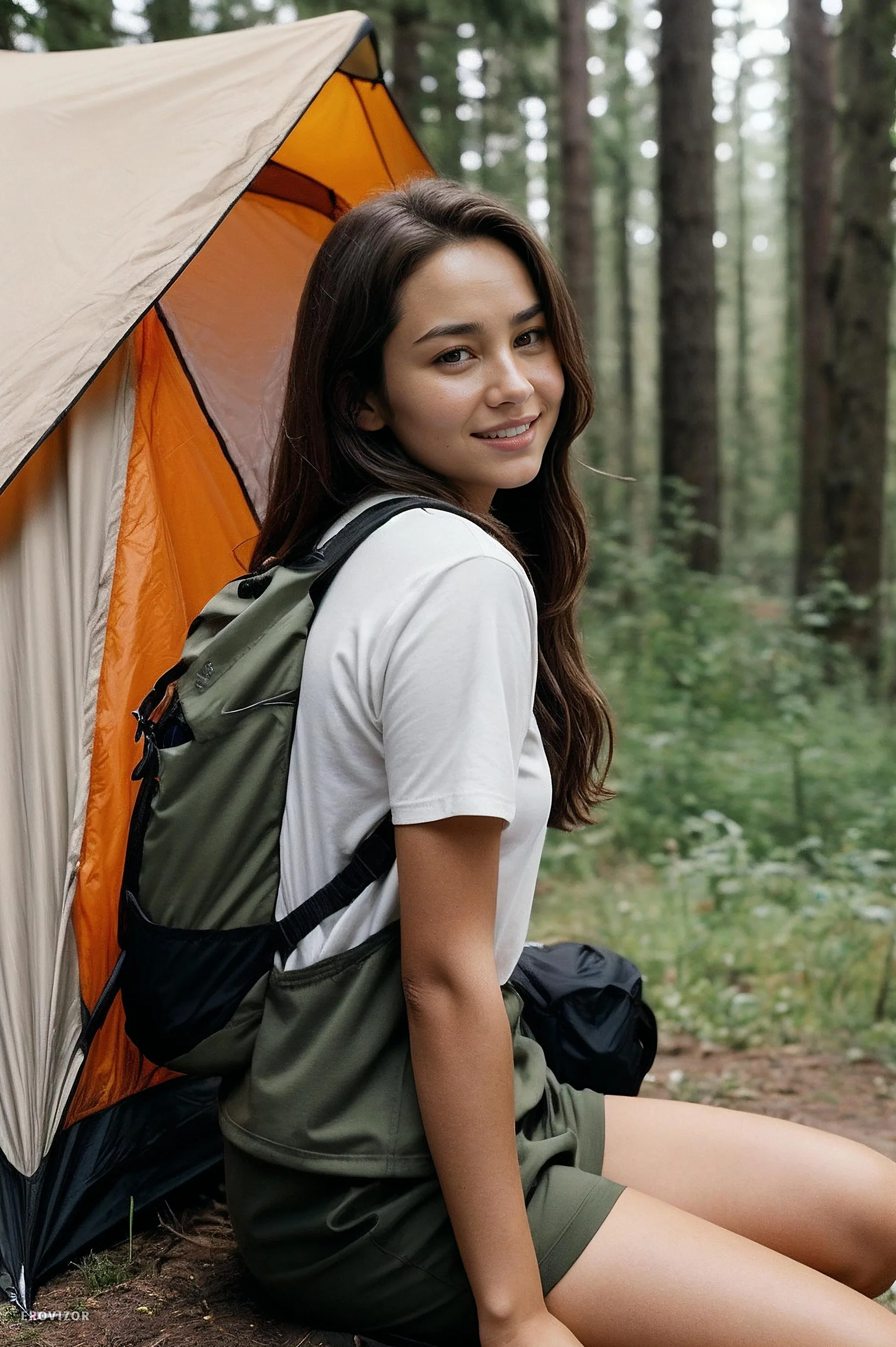 Девушка появляется в лесу среди высоких деревьев, уже расстёгивая верхнюю пуговицу коротких джинсовых шортиков. Шортики сползают, …