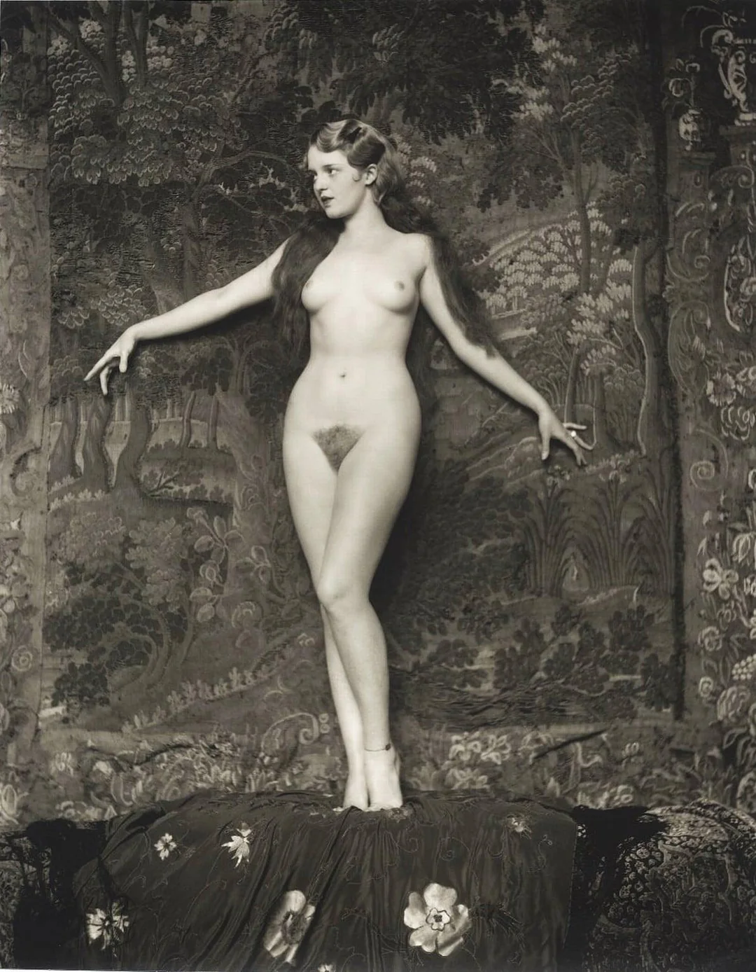 В этой необычной эротической фотосессии обнажённая женщина демонстрирует спортивную фигуру. Держась за длинные шторы, она буквально парит в воздухе
