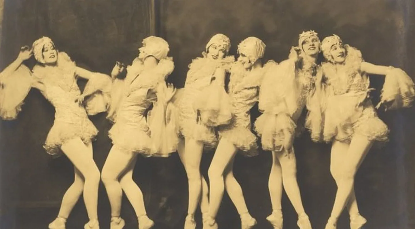 - Костюмы — максимально роскошные и откровенные для того времени: перья, страусиные боа, бисер, прозрачные ткани, длинные нити бус, меха, блестки, головные уборы с огромными плюмажами.