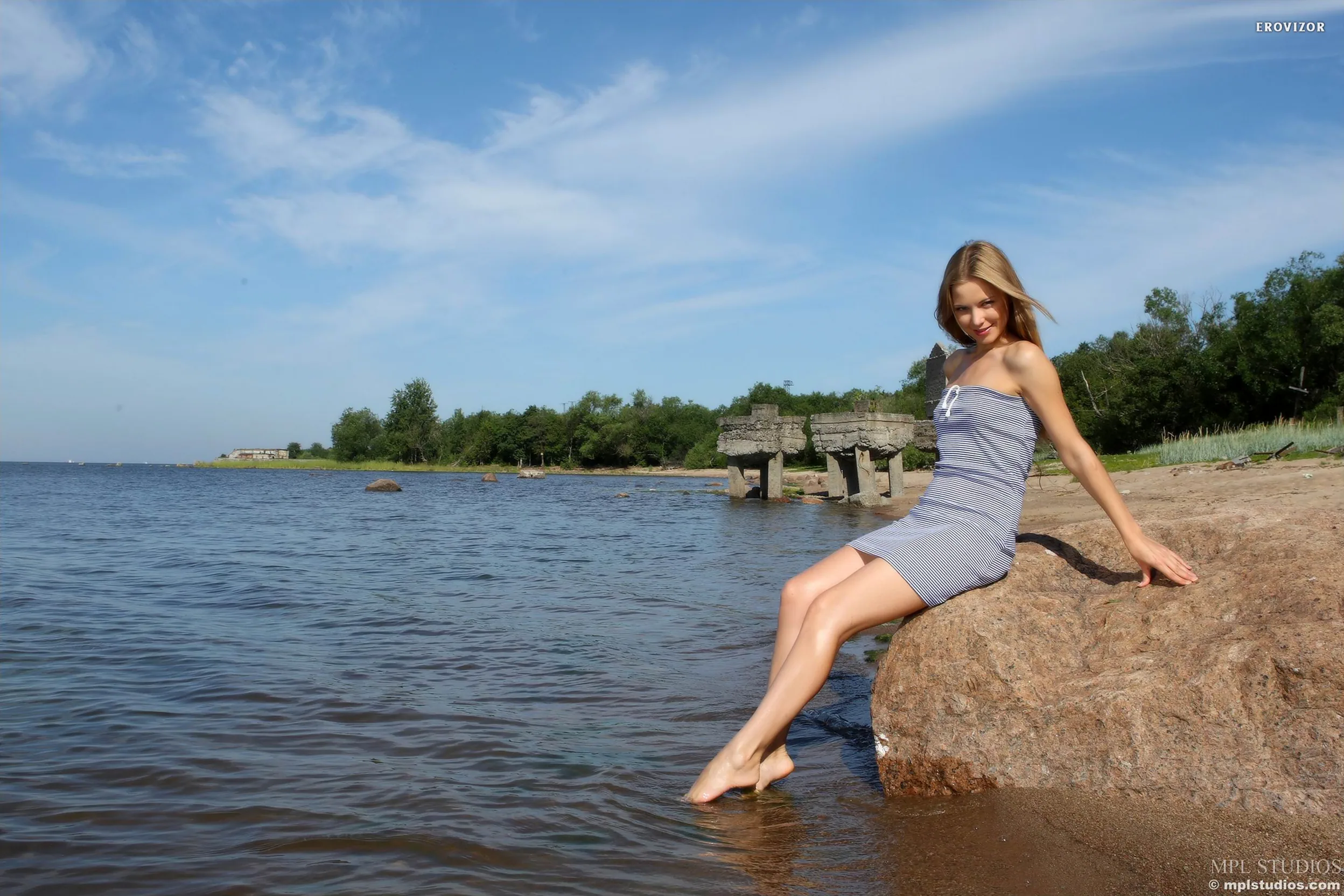 Эротика у старого пирса: Лучезарная блондинка на берегу реки
