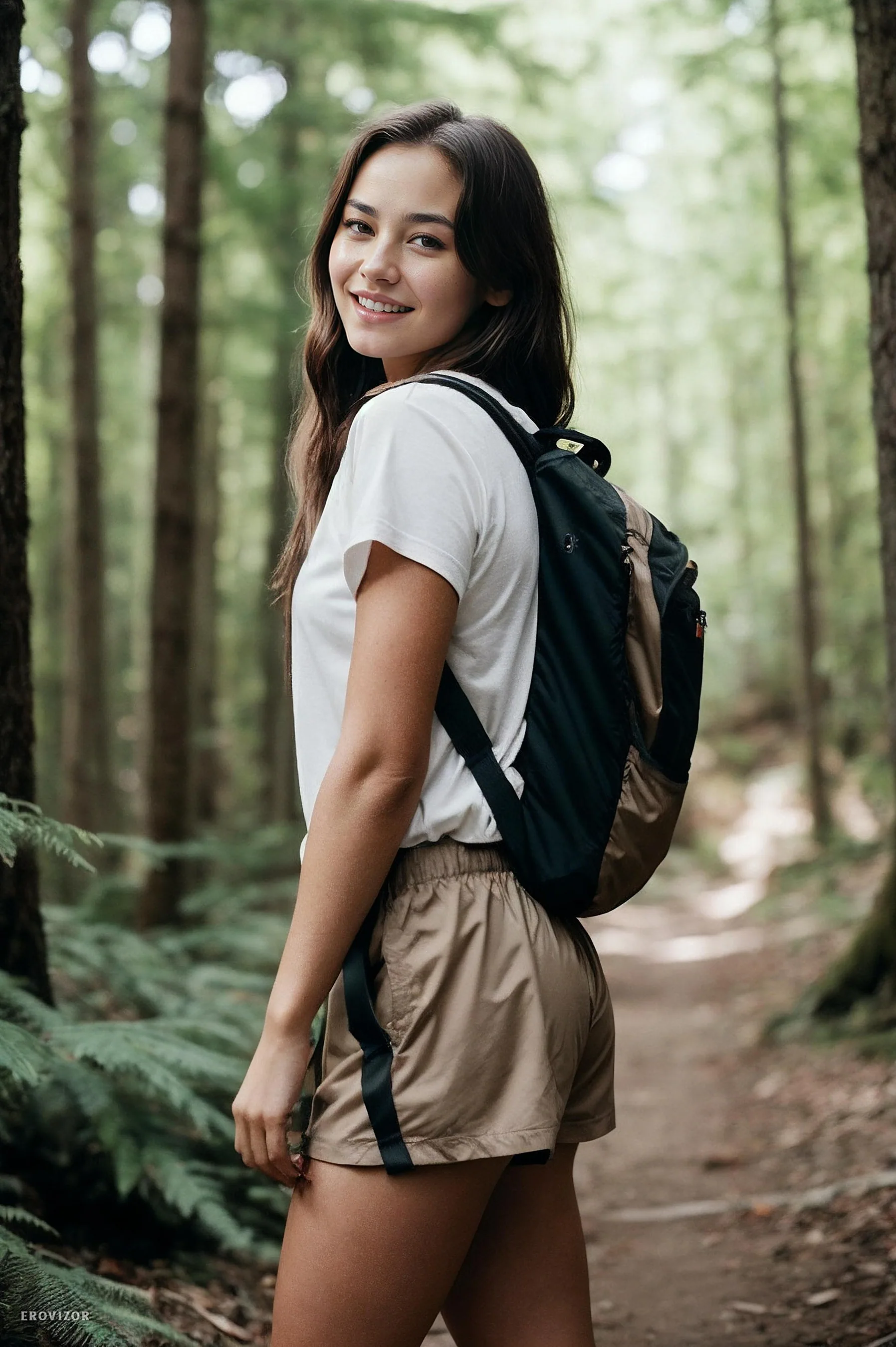 Наметилось романтическое путешествие вдвоём: вы уезжаете подальше от шума, ставите палатку в лесу. Закат окрашивает небо в розово-золотые тона, последние лучи играют на её загорелом теле — ровный, красивый загар, который так и манит. Как только стемнело, она расслабленно устраивается у палатки, наслаждаясь теплом и тишиной. Она забирается в палатку первой, садится, раздвигает ноги и смотрит прямо на тебя тем самым взглядом — «проведи эту ночь без сна, просто вдвоём под звёздами». Фонарик не нужен: лунный свет обрисовывает каждый изгиб её волнительного тела. Нежный треугольник ухоженных волосиков на лобке выглядит естественно и притягательно — именно такой, какой делает образ голой женщины ещё более трепетным и сексуальным, чем идеальная гладкость. В палатке пахнет хвоей и дымком от костра. Вы обнимаетесь, слушаете шорох листвы и далёкий плеск воды, целуетесь медленно, чувствуя тепло друг друга. Ночь проходит в нежных прикосновениях, тихих разговорах и ощущении полной свободы. Под утро вы оба засыпаете, прижавшись друг к другу, счастливые и умиротворённые. Это вылазка — настоящее романтическое приключение на природе.