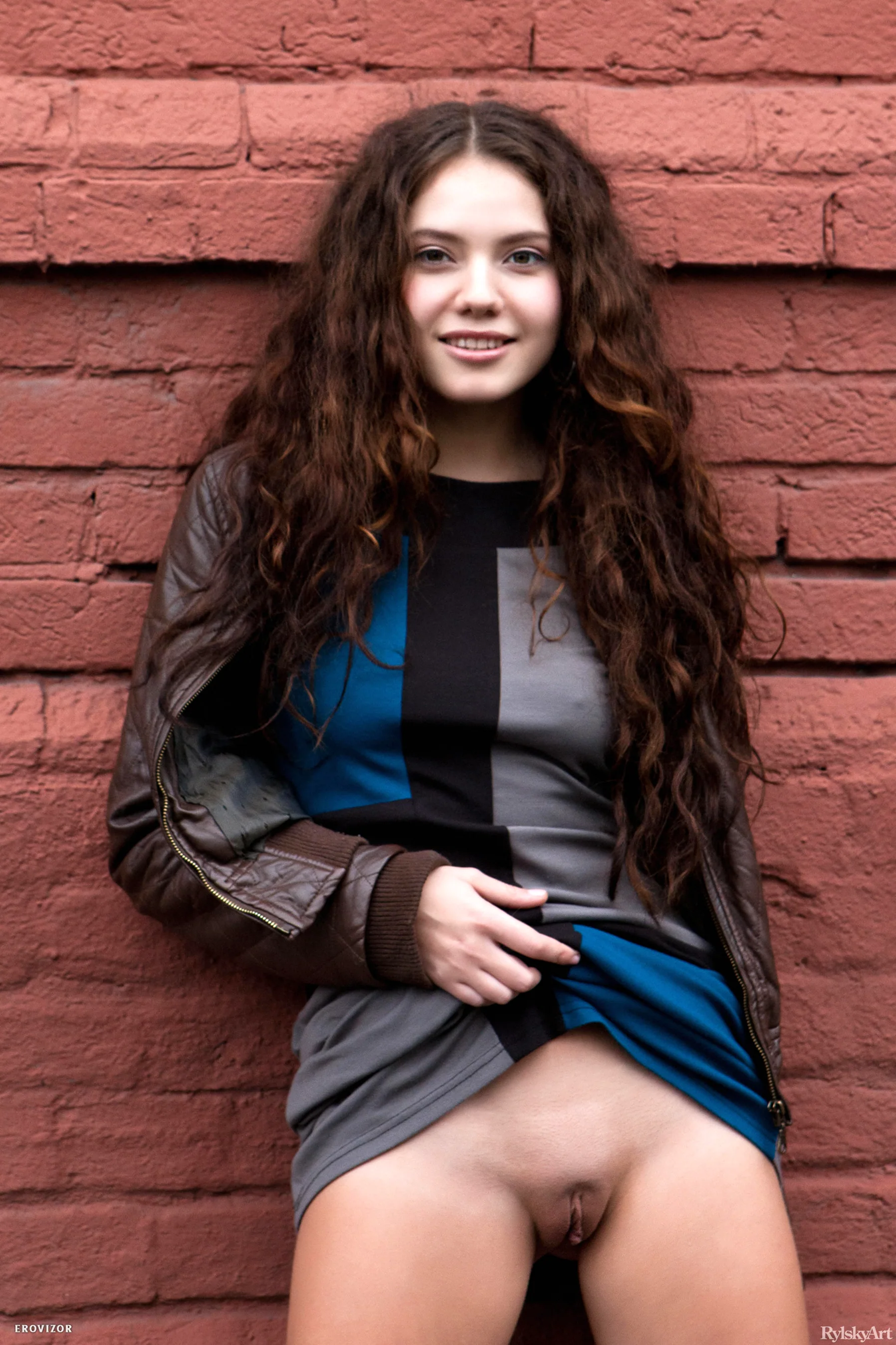 Очень обаятельная и весьма красивая девушка вышла прогуляться на улицу для рискованных эротических фото. Она не надела трусики под платье, которое задирает при удобном моменте и показывает свою бритую письку с выпирающими половыми губами и стоя и сидя прямо на улице.