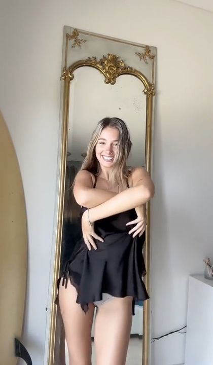 Милая девушка на видео в черном пеньюаре начинает свой импровизированный стриптиз расслабленно танцуя под музыку. Голая, она уже более уверенно даёт смотреть на своё сексуальное, красивое тело, то поворачиваясь задом, то трогая свои сиськи с пирсингом на одном соске.