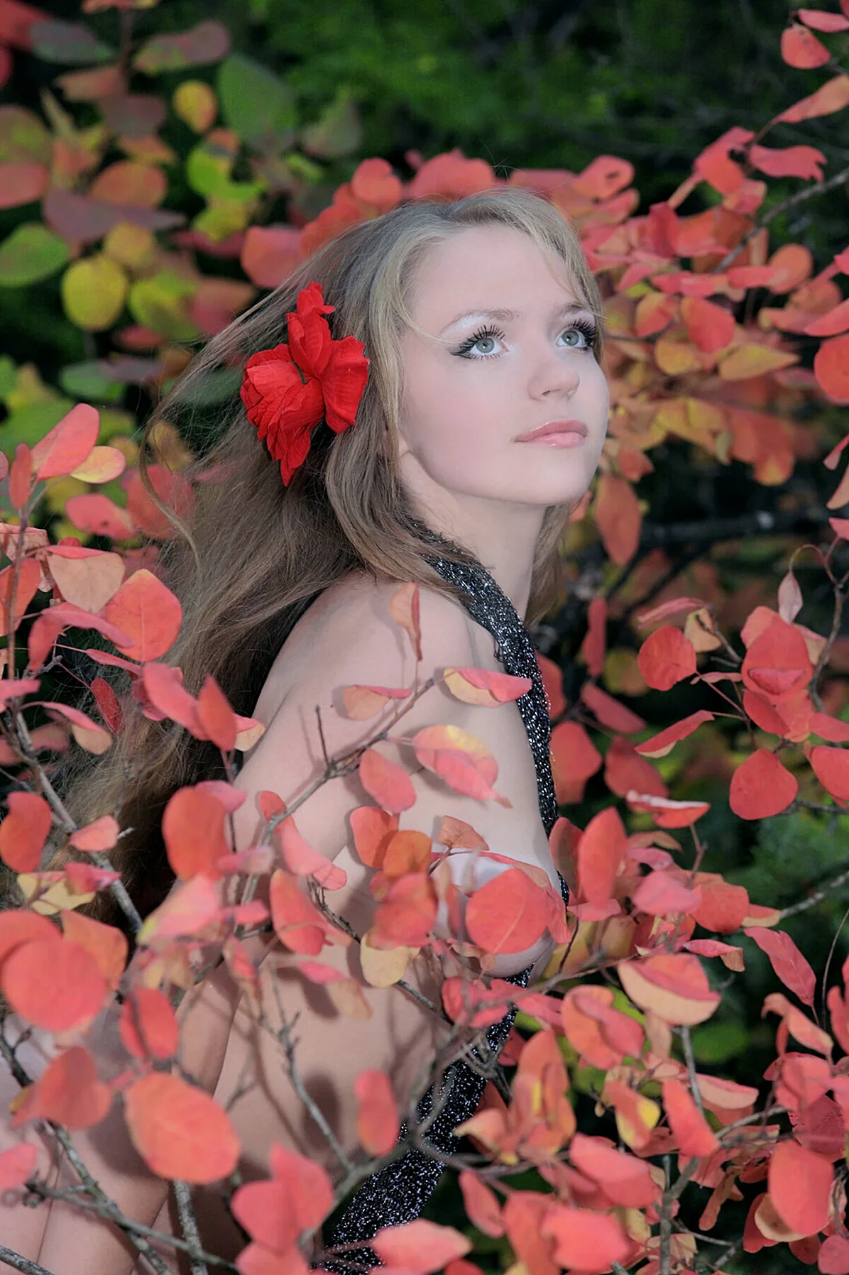 Ранняя осень дарит идеальный контраст: лес ещё сочный и зелёный, а кусты уже вспыхнули яркими красными листьями. На этом волшебном фоне разворачивается чувственная история Manilla — обнажённой девушки, чья стройная и невероятно сексуальная фигура кажется созданной для таких кадров.