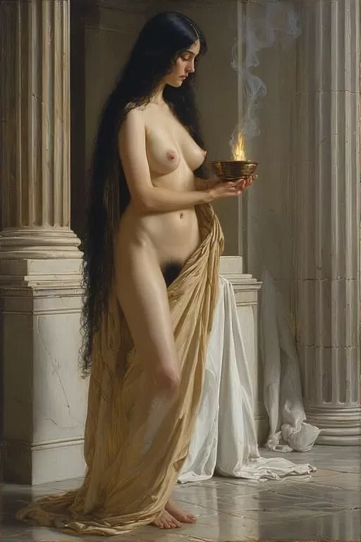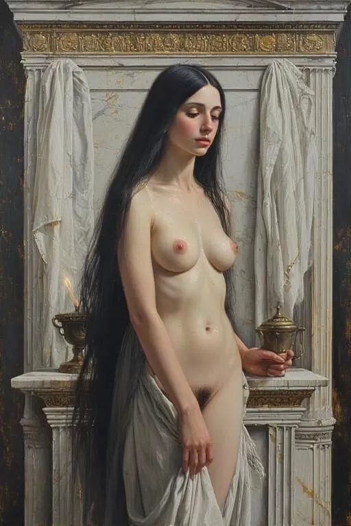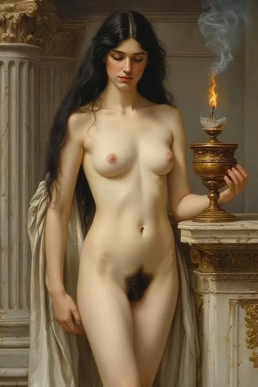 В просторном зале с высокими колоннами и мягким светом, льющимся сквозь витражи, собирались женщины. Их единственным одеянием была полная нагота, символ абсолютной искренности и свободы от любых масок. Они выстроились полукругом, словно жрицы древнего таинства. У всех женщин волосатый лобок и длинные волосы (почему?) — потому что это было сознательным выбором: густые натуральные заросли на лоне подчёркивали принятие своего тела таким, каким его создала природа, а длинные, никогда не стриженные волосы служили знаком внутренней силы и независимости. В руках чаши для окуривания тихо тлели благовония: сандал, пачули, смолы. Тёплый дым поднимался вверх, мягко обволакивал обнажённые тела, расслаблял кожу и разум. Главная среди них вышла вперёд и тихо сказала: «Сегодня мы здесь без одежды, чтобы ничего не скрывать — ни тела, ни мыслей. Нагота — это честность. Дым — это дыхание свободы. Наши волосы — это мы настоящие». Женщины медленно опустились на колени, поставили чаши перед собой и закрыли глаза. Длинные волосы скользили по плечам и полу, дым заполнял зал приятным ароматом. В этой полной обнажённости не было ни капли стыда — только глубокое спокойствие и ощущение единства. Когда дым поднялся до потолка, они одновременно выдохнули. Ритуал завершён: каждая почувствовала себя цельной, сильной и абсолютно свободной.